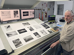 Vern, Pressman at Friesens Printing, Altona, Manitoba, Proofing Borderlands during print run February 12th, 2020.