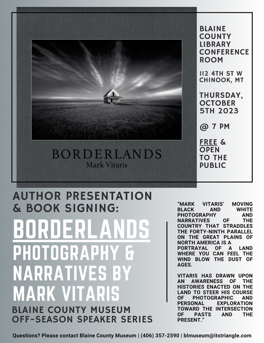 Borderlands Book Presentations are scheduled for October 5th in Chinook, Montana and October 7th at 1PM at the C.M. Russell Museum in Great Falls, Montana